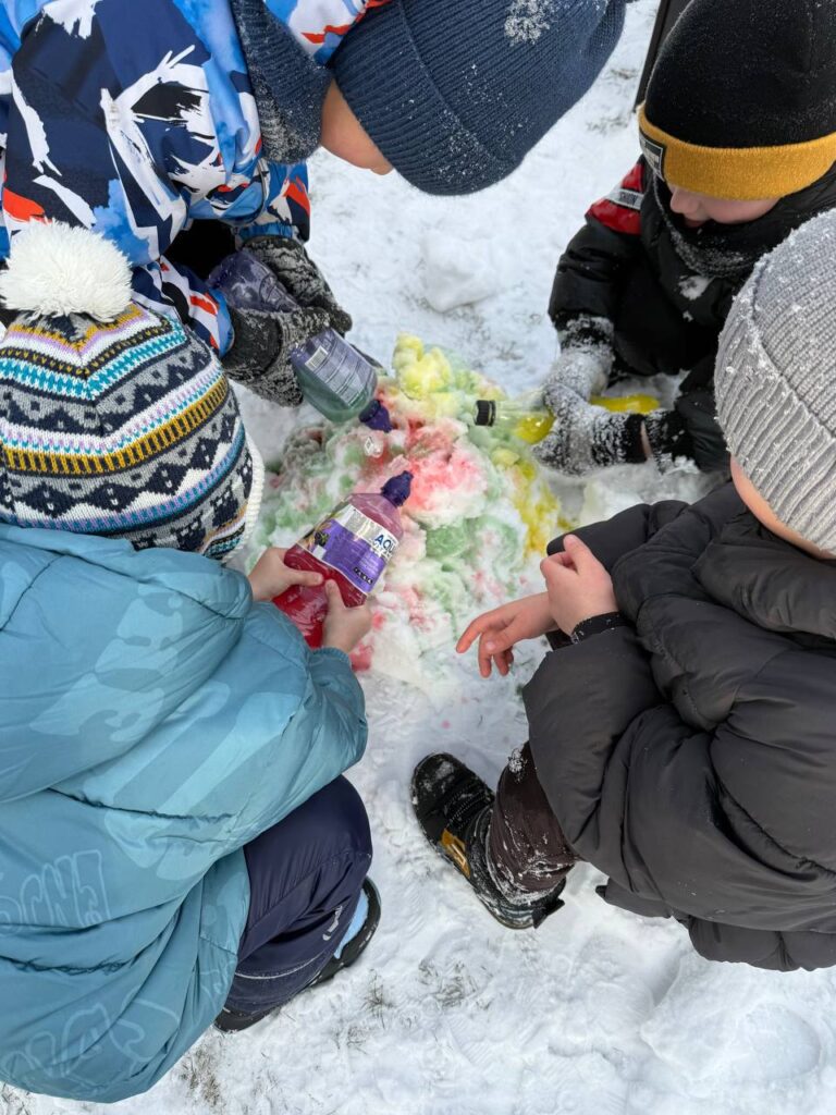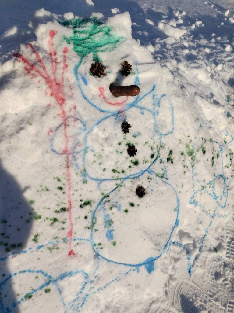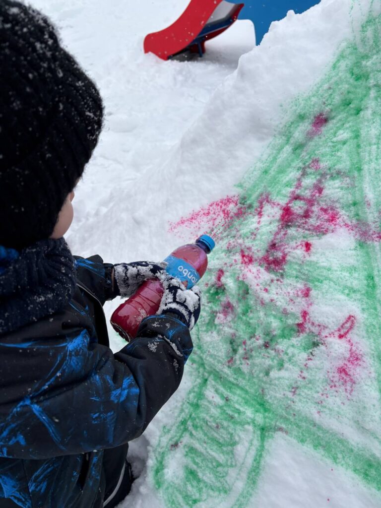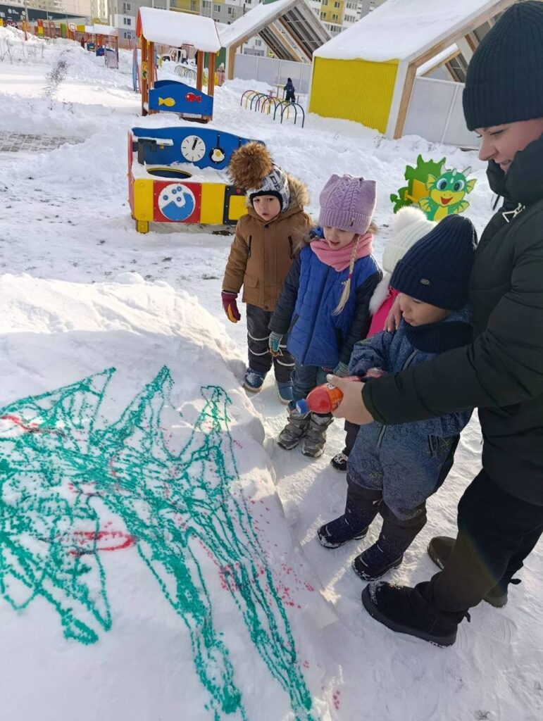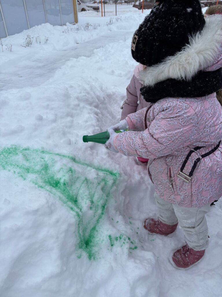 А рисовать на снегу – это так красиво! Можно пальчиком, прутиком, лопаткой, а можно – водой! Нам понадобиться пластиковая бутылка с подкрашенной водой и две крышечки. Одной крышечкой закрываем бутылку, чтобы удобно было нести. Во второй делаем отверстие. На прогулке меняем крышки. Инструмент для зимнего рисования готов!